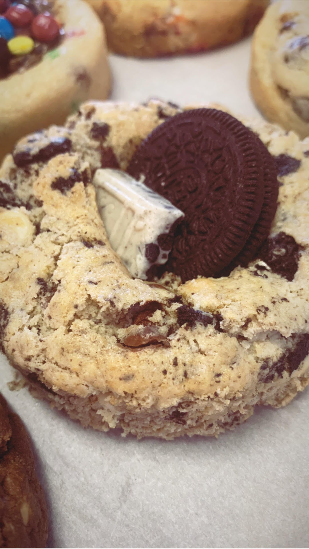 This is the best cookie! It's a brown sugar cookie base using Oreo pudding mix. Crumbled Oreo chunks, Hershey's cookies n' cream candy chopped up, semi-sweet and milk chocolate chips are mixed in, and the cookie is topped with an Oreo and a chop piece of Hershey's Cookies n Cream candy. Does it get any better than that? This cookie has gotten rave reviews by the Savannah locals. Two "sweetie" thumbs up!