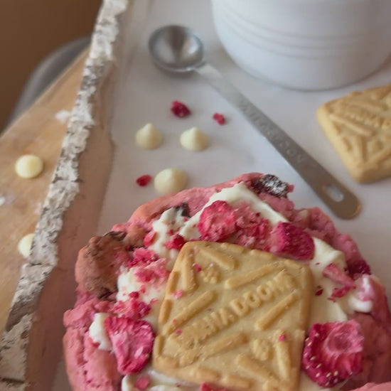 Our 6-ounce Strawberry Shortcake Cookie is pure nostalgia, baked thick and unapologetically extra. Lightly almond-kissed dough is swirled with that unmistakable strawberry milk magic (yes, the good stuff), studded with dried strawberries, and dotted with creamy white chocolate for the perfect balance of fruity and sweet.